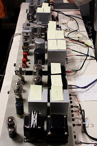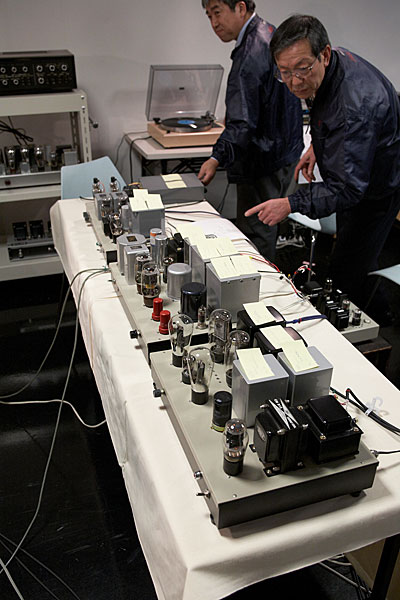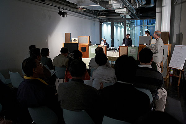 この日の為に、第一回のオーディオ・シェフである本間武昭(ほんま・たけあき)氏と、助手の村越武蔵(むらこし・たけぞう)氏はどんなレシピ集でいくか、頭を悩ませ開催の直前までエンジニアの佐々木泰次氏と遠藤良夫氏たちと協議を重ねた。満を持して、オーディオシェフチームが持ち込んだスピーカーは、なんと7台。