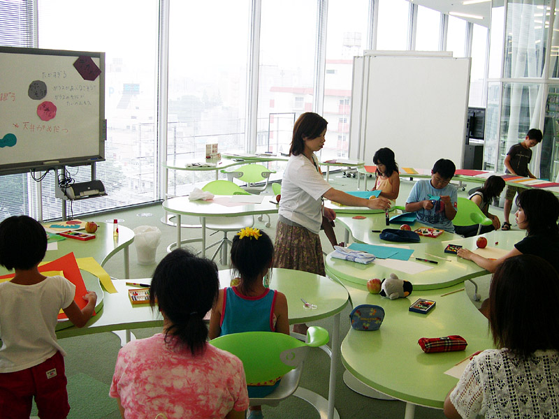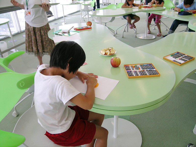 触れて感じたことを,表現するのがこのツアーのテーマです。オイルパステルで絵を描いたり、メディアテークにある家具や床を触りながら探検しました。