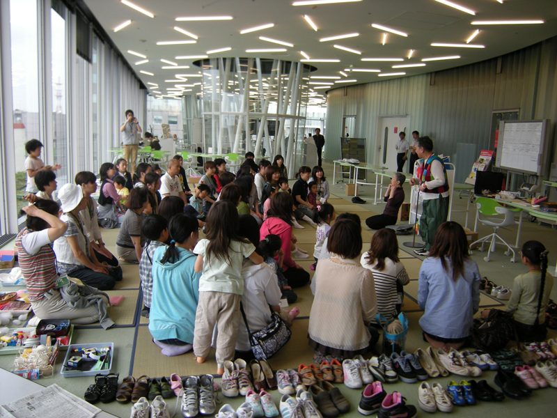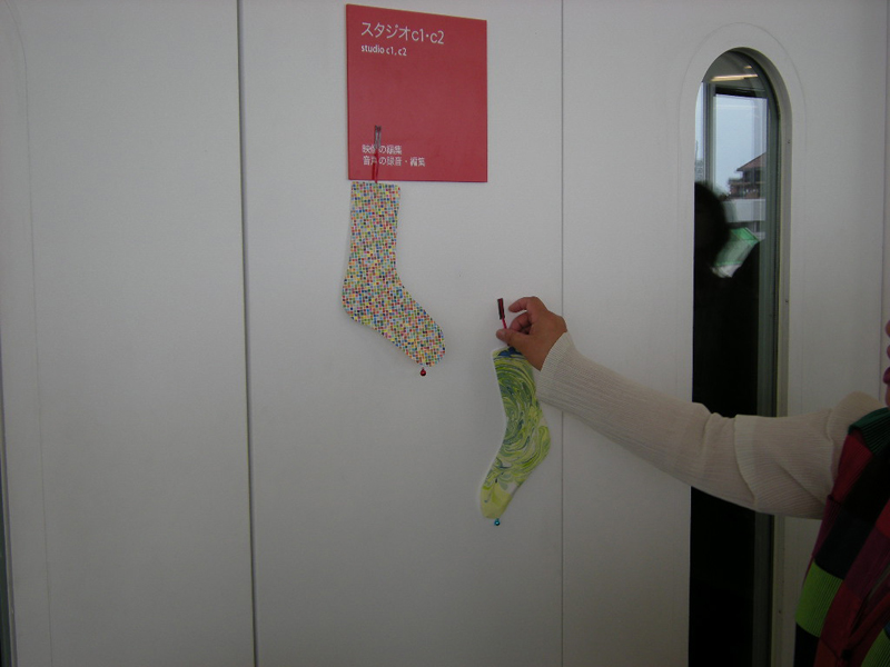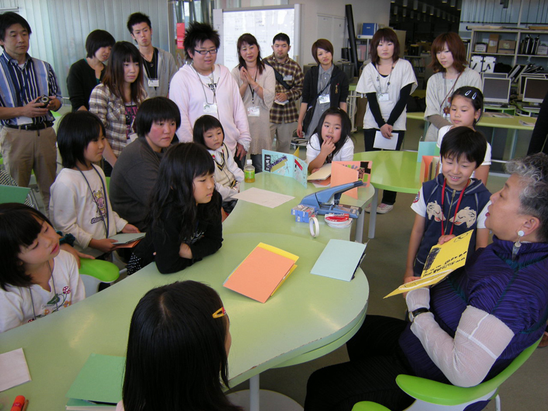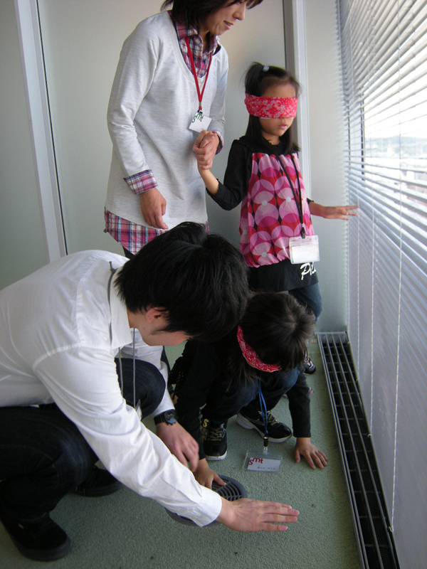 講師に美術家の関口怜子氏をお迎えし、絵本を読んだあと、目かくししながらメディアテークを散歩。壁もドアも床もさわってみた感じ、手や足や耳でふれた感じを絵本にしました。目の不自由なかたへのサポートもありました。