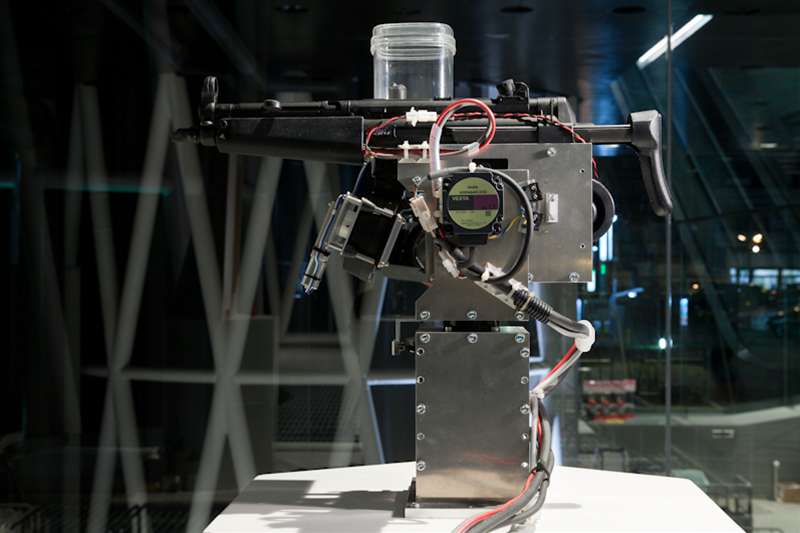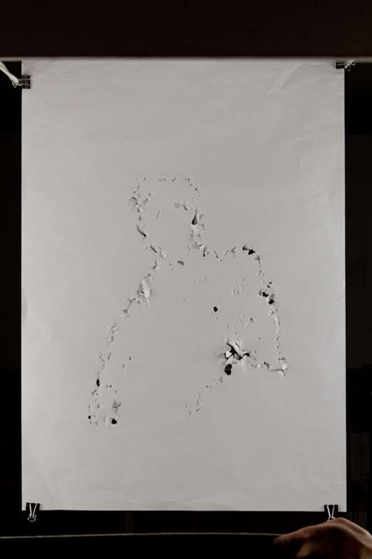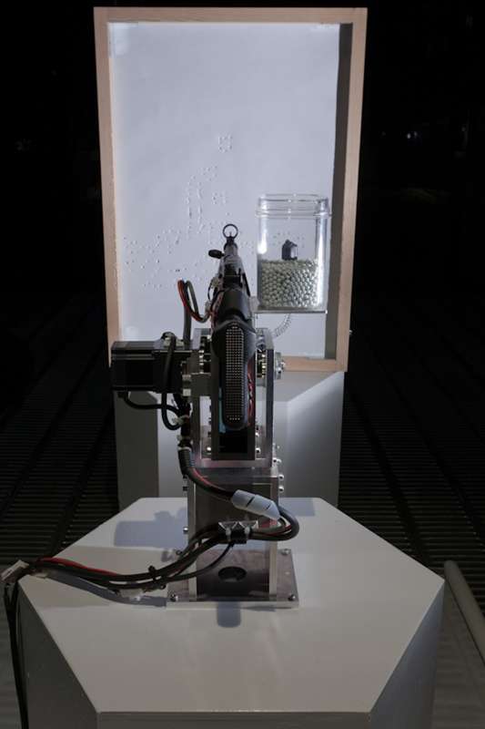 コンピュータープログラミングや制御技術を駆使した装置によって、鑑賞者の像がエアガンで描き出されるインスタレーションをおこないました。また、7階の5番チューブ周辺では、第13回メディア芸術祭受賞作品のダイジェスト映像を上映しました。