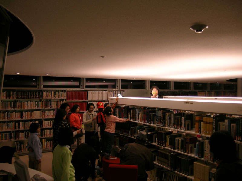 夜のメディアテークの表情を楽しむ照明ツアー。各階の用途に合わせて考えられた照明デザインをみて歩き、光の明るさの不思議を体験しました。