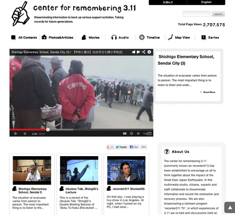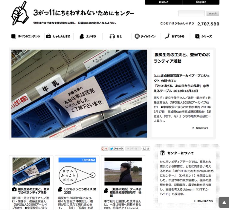 市民、専門家、スタッフが協働し、復旧・復興のプロセスを独自に発信、記録します。映像、写真、音声、テキストなどを「震災の記録・市民協働アーカイブ」として記録保存しました。また、一人ひとりの震災体験を語り直し震災復興の支援活動について考える番組「わすれンTV311」をインターネット配信ustreamを通し、合計47番組を配信しました。 また、オランダ政府のご支援により、当サイトの英語版を2012年7月1日(日)に開設しました。