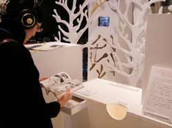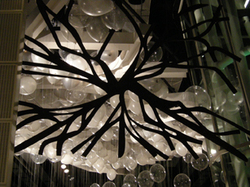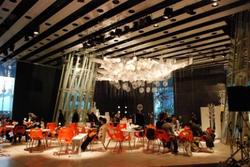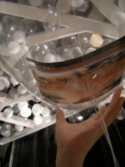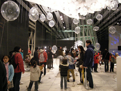 そして、これら複数のイベントが行われる会場の空間デザインを、仙台在住のインテリア・空間デザイナー尾形欣一氏に手掛けていただきました。尾形氏は「光のページェントと連続する空間」をテーマに、欅を模したオブジェを天井に吊るし、300個の風船をそのオブジェの内側にいれて、ページェントの光や木漏れ日を表現しました。風船は非常に高い位置にあって、ほとんどは紐に触ることもできませんが、20個だけは下まで紐が伸びており、紐を手繰り寄せてみると、風船の中には文化人がセレクトした仙台のお気に入りの写真が入っていてみられるというものです。