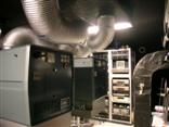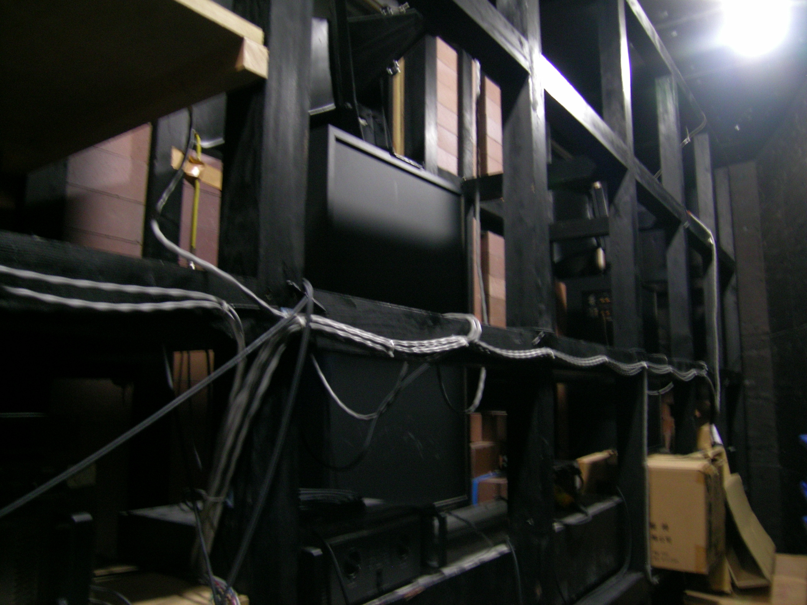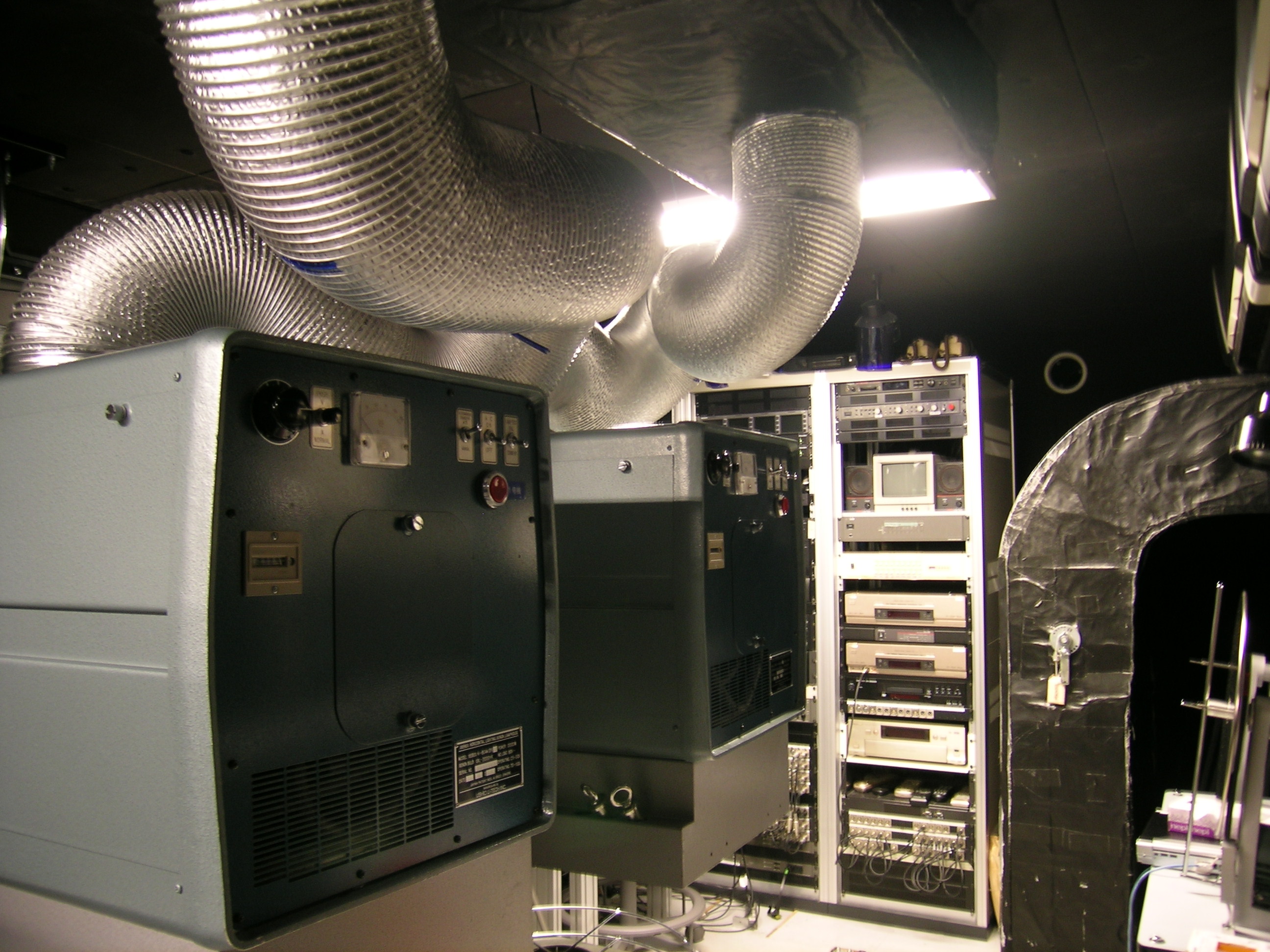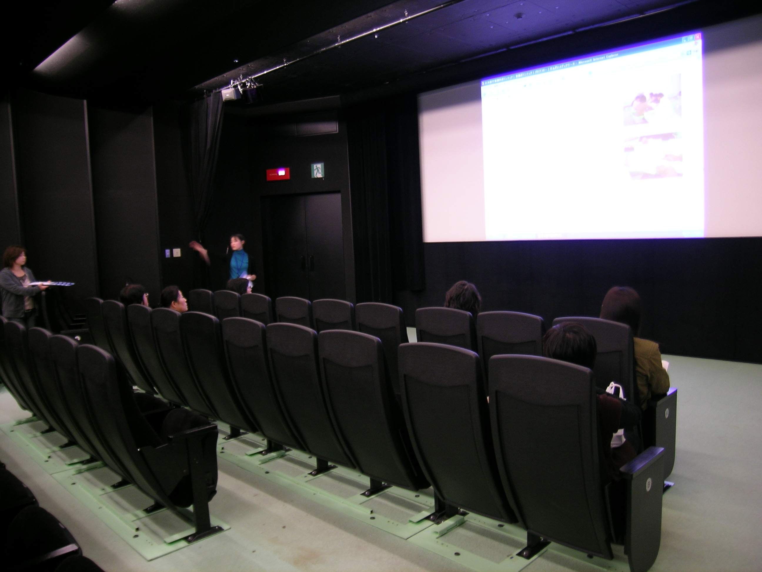 シアターのバリアフリー設備について説明後、スクリーンの裏側や35mm映写機等が設置してある調整室を見学しました。