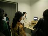 スクリーンに映し出されたパソコンの画像を見ながら、音声解説、日本語字幕作成の手順について説明。実際に活動している、音声解説、日本語字幕制作ボランティアから、作成時の苦労話や実際に活動してみての感想を聞きました。