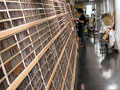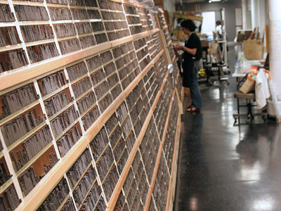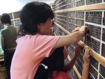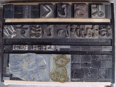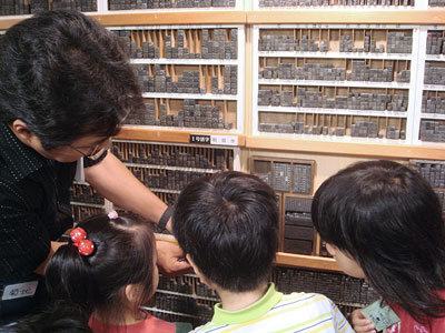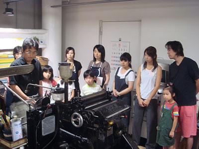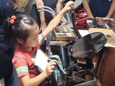 今回の活版は親子で参加のサマーカード作り。参加者は小学校低学年のお子さんとその親御さんが中心です。最初から長い話をすると子どもたちは飽き飽きしてしまうので、集まるとすぐにカッパン工房の不思議探検に出かけました。前置きはササッと流す程度、それよりも実際のモノや道具に触れてみます。活版の活字が貯えられた馬(活字の棚)や、手刷りできる印刷器、ハイデルベルグ社の大型印刷機を動かしたり、普段は体験することのできない古き良きマシーンを興味深く見学する子どもたちの姿が印象的でした。