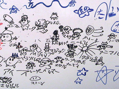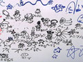 1日だけのワークショップなので、一版一色(今回は参加者の要望で青色と黒色)で、2色の印刷を体験します。午前は、見学→組み→試し刷りと、早いチームは次々と進んでいきます。お昼を挟むとほとんどのチームが印刷。しかしここでどのチームの子どもたちも少しバテ気味。子どもにとって印刷を待つ間の時間を何もしないで待つというのは難しいことです。早速、ホワイトボードへのお絵書きや工作の時間となりました。しかしそのお絵かきで生まれたキャラクターも今後のカード作りにいかされ、子ども達の絶え間のないエネルギーとイマジネーションには脱帽です。