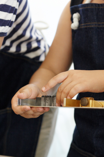 テーブルの上には、鉛でできた活字がずらりと並んだレトロな木箱があります。サイズが1号(正方形の一辺が10mm)の活字で「また,おいでね」「もりのめぐみ」と組まれたものが用意されているので、4号(正方形の一辺が5mm)の活字部分を、自分の名前や好きな言葉に組み替えて版を作ります。まず、欲しい活字を見つけて集めます。これを、活字を「拾う」と言います。漢字を見つけるのにはとても時間がかかってしまうので、このワークショップでは、ひらがなとカタカナから選びます。次に、「組版ステッキ」という専門の道具に活字を並べ、寸法に合わせて活字の間や左右に、「インテル」という何も字が掘られていない背が低い鉛を入れて調節します。普段は携帯電話やパソコンで打つと、つらつら繋がって表示される文字も、活版印刷ではインテルが入ることでリズムが生まれるので、どのくらい文字間を空けるのかセンスの見せ所でもあります。崩れないように指にぎゅっと力を込めて、組んだ活字を組版に入れます。これを、活字を「植える」と言います。まるで木を植えるみたいです。組版には以上のような作業で植えられた活字が段々になって「チェース」という金属枠の中にきっちりと入っています。活字の高さを揃えるために、組版の上に木をのせて木槌でとんとんと軽く叩きます。活字がぽろっと落ちてしまわないように、ねじ式のジャッキを念入りに閉めます。