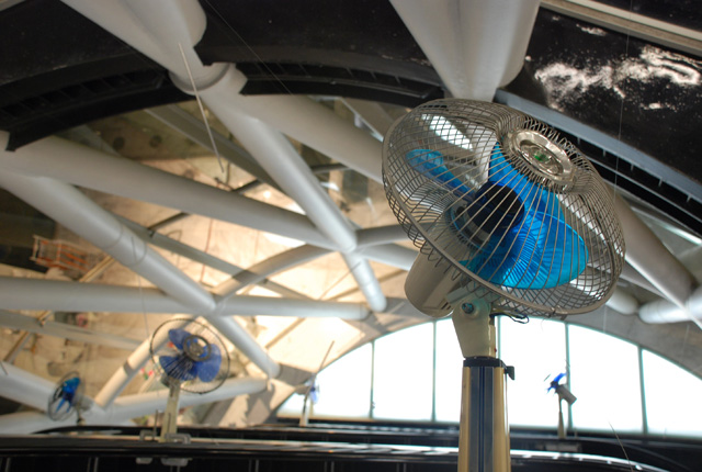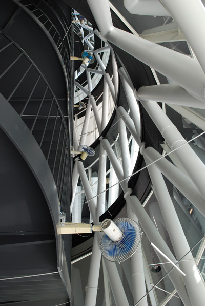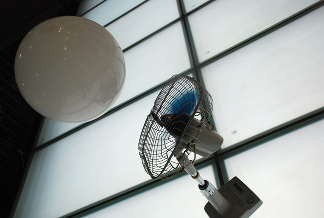 電極を取り付けて改造した扇風機などのオブジェに音声信号を流し、電圧コントロールが可能なディマーという調光装置と組み合わせることで、それぞれのオブジェのモーター回転数を調整します。30メートルの縦空間の中にいくつも配されたオブジェは、それぞれが自律的そして連鎖的に可動します