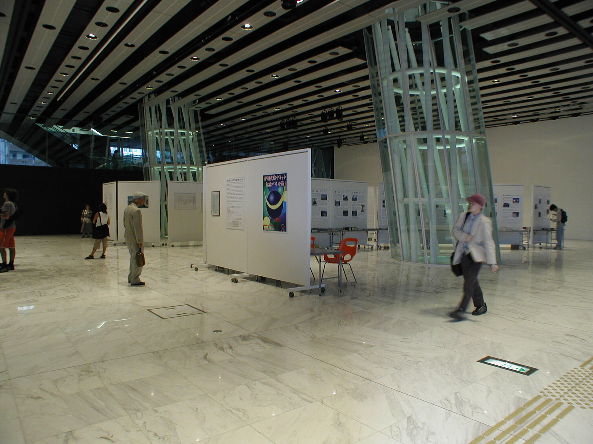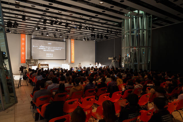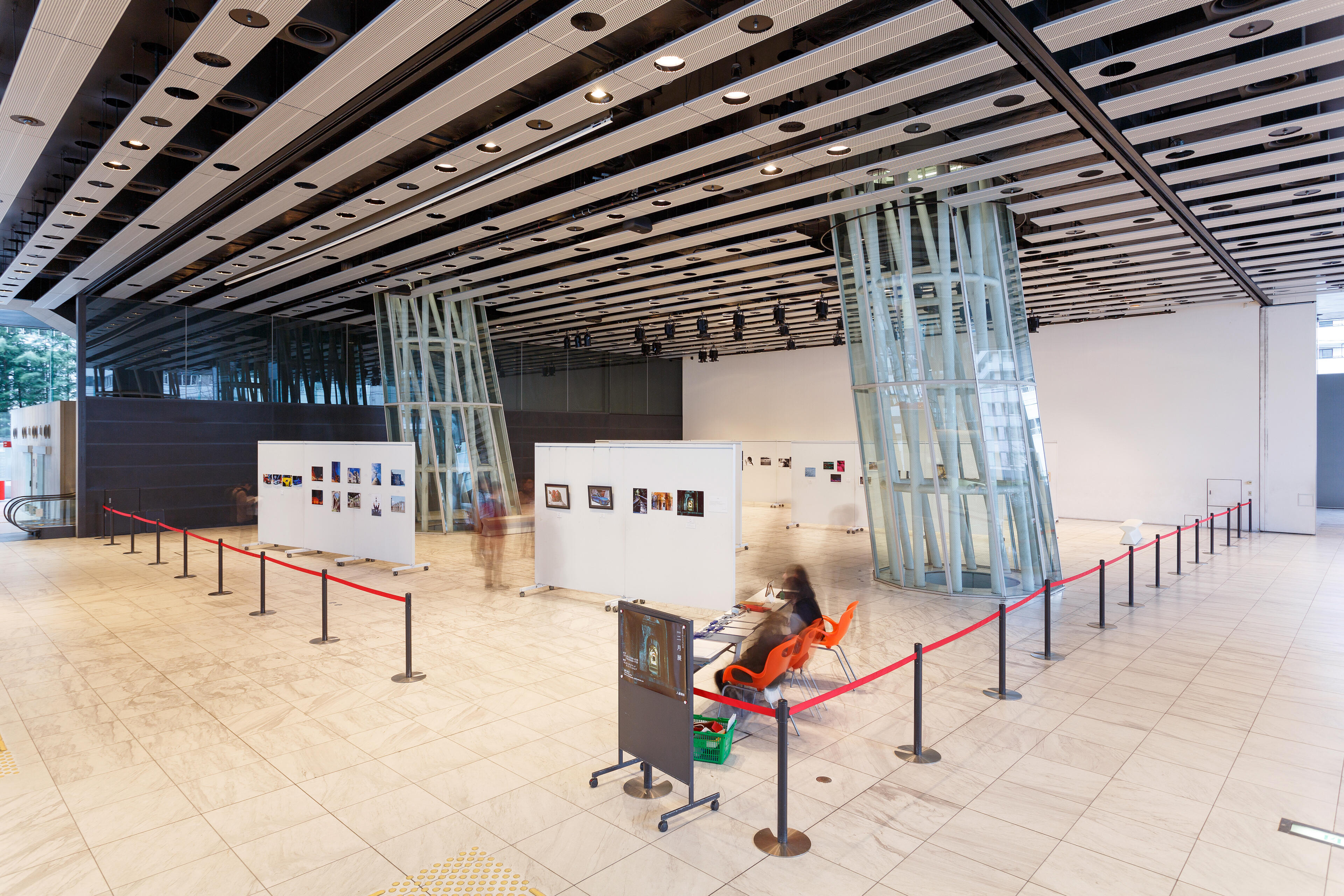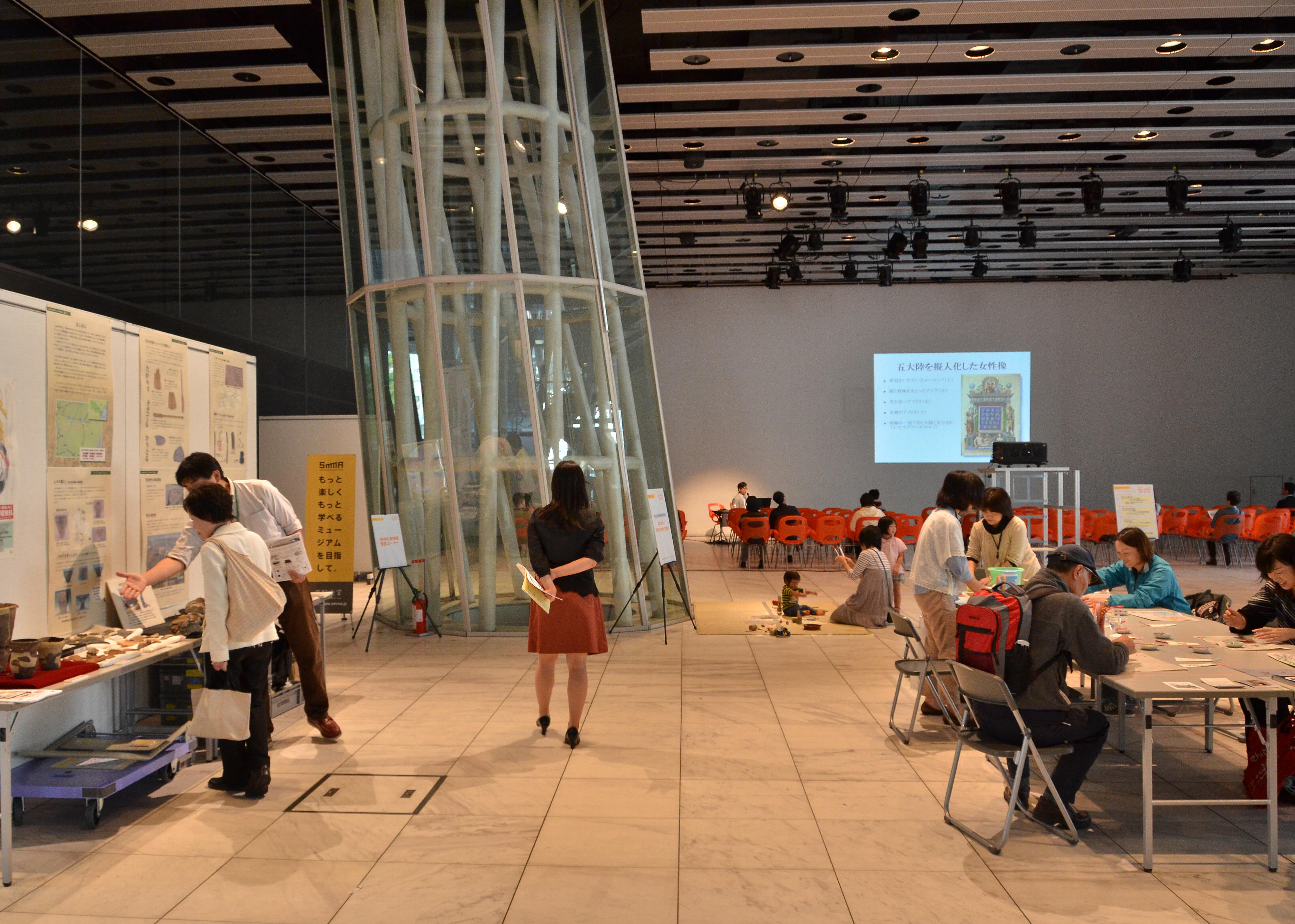講演会、シンポジウム、コンサート、展示発表会、演劇など多目的に使用できる空間です。 天井ルーバーまでの高さ約6メートル、約20メートル四方の空間を、可動パネルで周囲を閉じて使うことができます。 幅12メートル、高さ6メートルの大型スクリーン(位置固定)があり、両面投影できるので、館の外からも鑑賞が可能です。