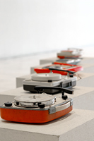 "Without Records" is an installation made of sound emitted by portable record players on which records literally are not placed. It is the work of Otomo Yoshihide, a musician who has been working on the possibility of music and sound. Please experience how resonance is caused by the strength of the open square on the first floor of sendai mediatheque and the humble sounds emitted by the players from various periods and designs.
