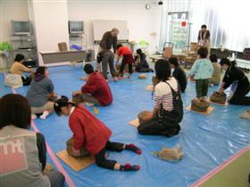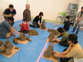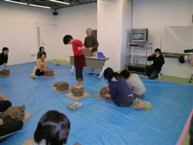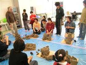 参加者一人一人の前には20kgの粘土のかたまり。 全体重をかけてこねる女性、裸足になって踏むつぶす子ども。 扱い方はさまざまです。 さてワークショップが進むにつれ、粘土はどのように変化するのでしょうか。