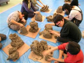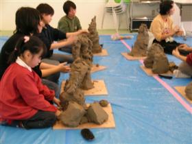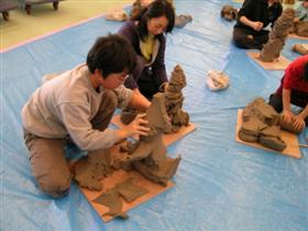 まずはウォーミングアップに「高いもの」をつくってみました。 一口に「高いもの」といっても、細長い円錐型や、たけのこのような形、 表面がぼこぼこしたもの、粘土を厚く切って重ねたもの、 いろいろな「高いもの」ができました。