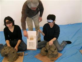 できあがったものを、まずは手で鑑賞します。 手でみたあと、アイマスクをはずしてみると… 手でみたときとは違う印象にみなさんびっくりしたようです。